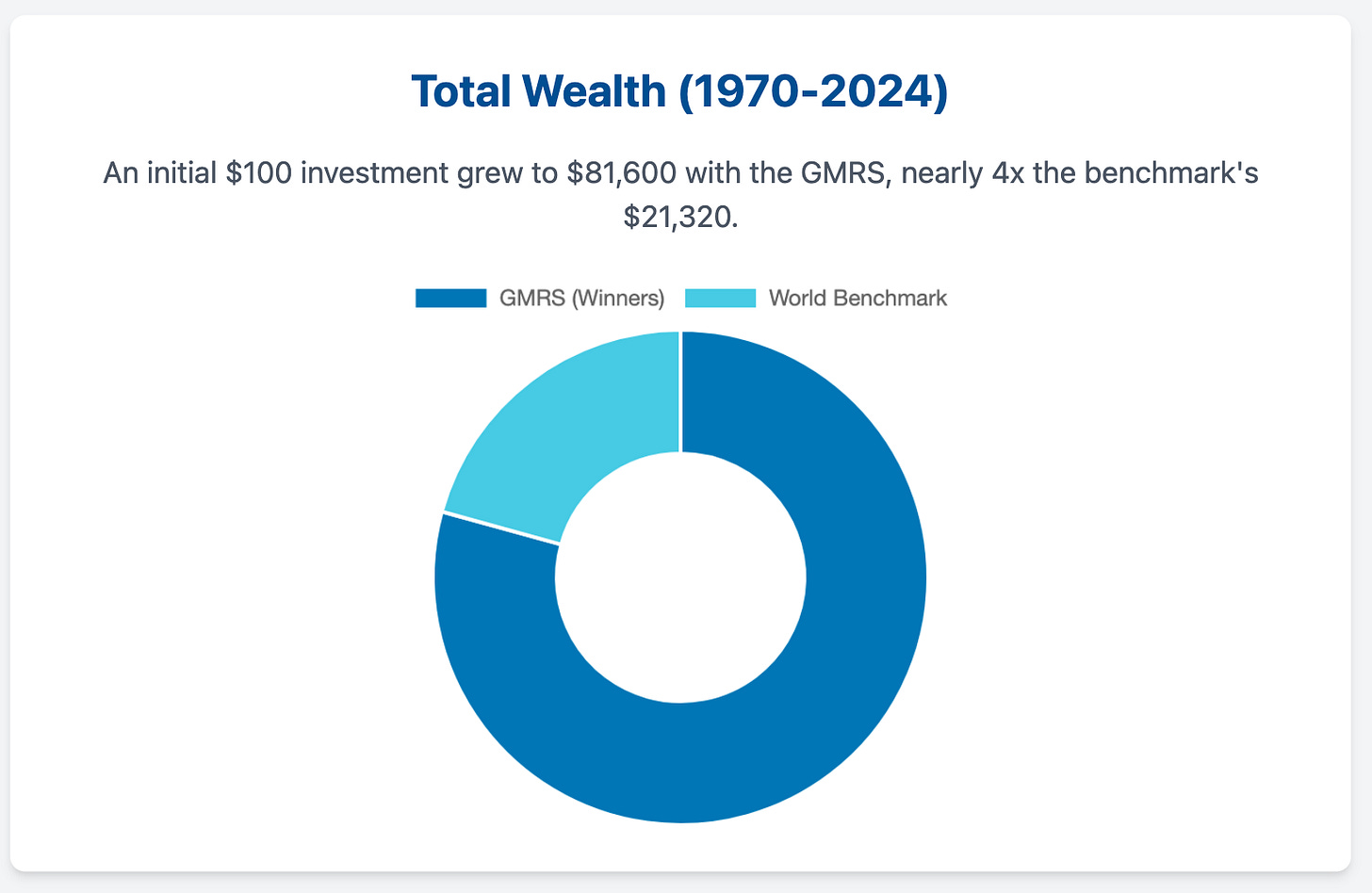 From June 1970 through December 2024, GMRS compounded at 13.09% annually, well ahead of the MSCI World’s. That 275-basis-point gap over MSCI may sound modest, but compounding makes it massive: