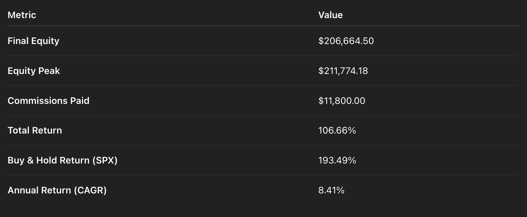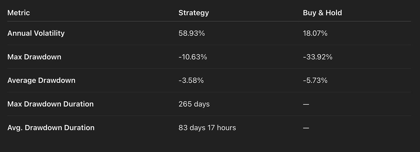 Risk-Adjusted Edge: This strategyâs raw return is lower than buy-and-hold, but the max drawdown is three times smaller (11% vs. 34%). You compound steadily with less stress and lower capital risk.