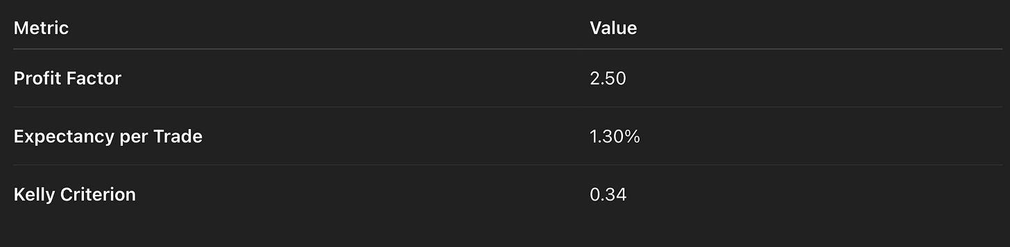 Profit Factor > 2.5: For every dollar risked, the strategy earns $2.50. This rare metric reflects high-quality entries and disciplined exits that consistently generate profits.