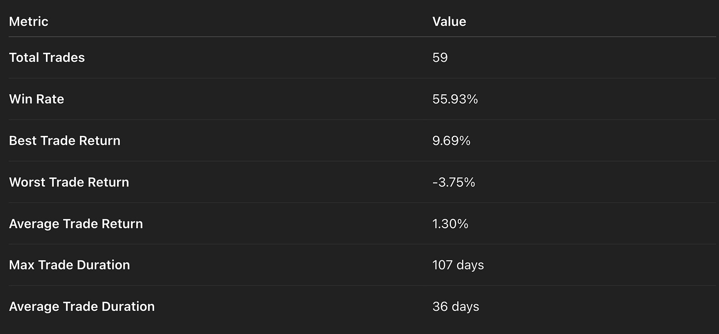 Efficient Trade Selection: Only 59 trades over nearly 9 years means no overtrading. This selective approach preserves capital and transaction costs while keeping a strong statistical edge with a 56% win rate.