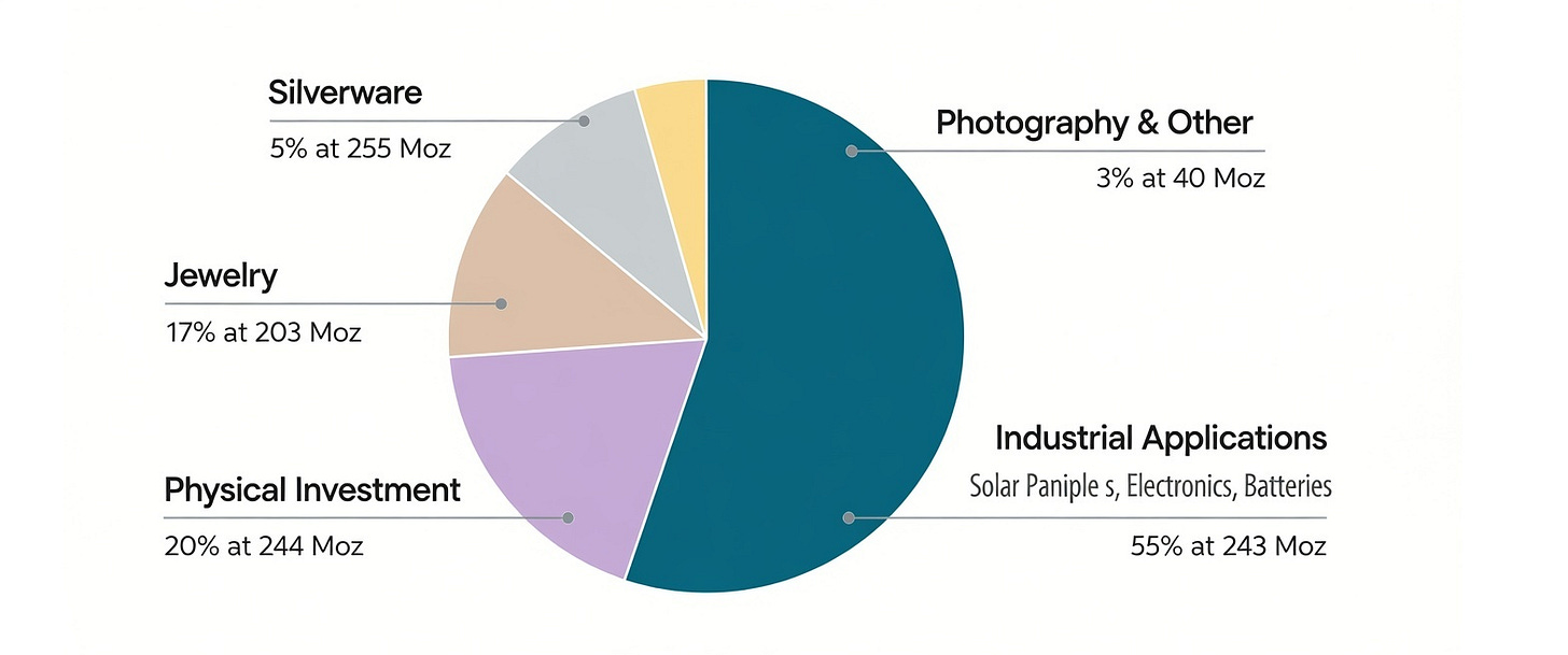 Silver isn’t gold. People don’t just stash it away for the future. Close to 60% of silver demand is industrial—solar panels, EVs, semiconductors, data centers. These are essentials. Manufacturers don’t hit pause because silver gets pricey. They pay up and keep moving. That’s why silver’s price can spike so quickly: investment demand can surge if confidence in money falters, industrial demand stays solid, and supply can’t catch up. The only real answer is for prices to reset higher.