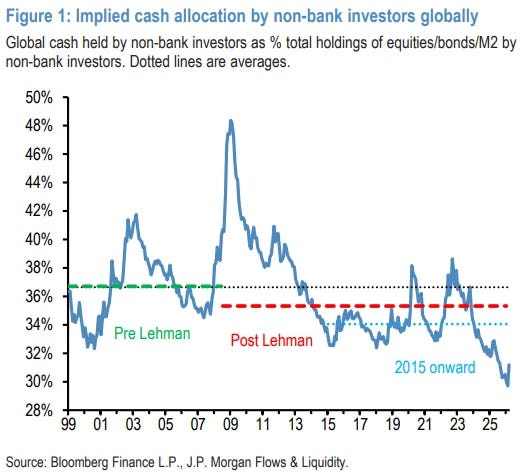 Perhaps the most alarming signal in Q1 2026 is not the oil price, nor the yield spike, nor the geopolitical flashpoint. It is a quieter number buried in J.P. Morgan’s flows data. Global non-bank investors’ cash holdings, measured as a percentage of total equities, bonds, and M2, have fallen to roughly 30%: near the lowest level this century. The post-2015 downtrend has continued without interruption, carrying cash well below both the pre-Lehman average and the post-Lehman average. Investors are, in the bluntest possible sense, all in.